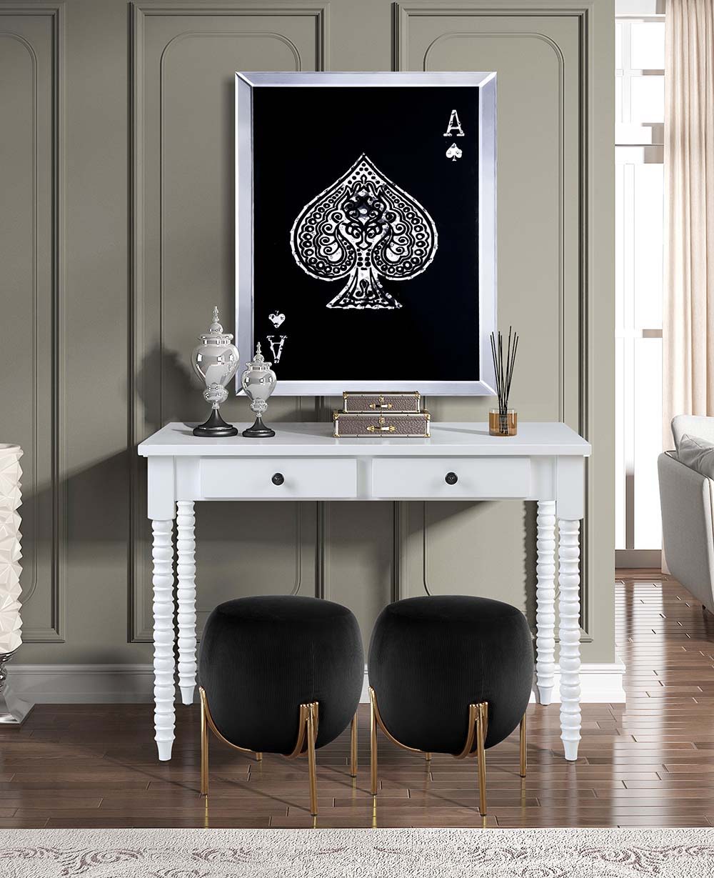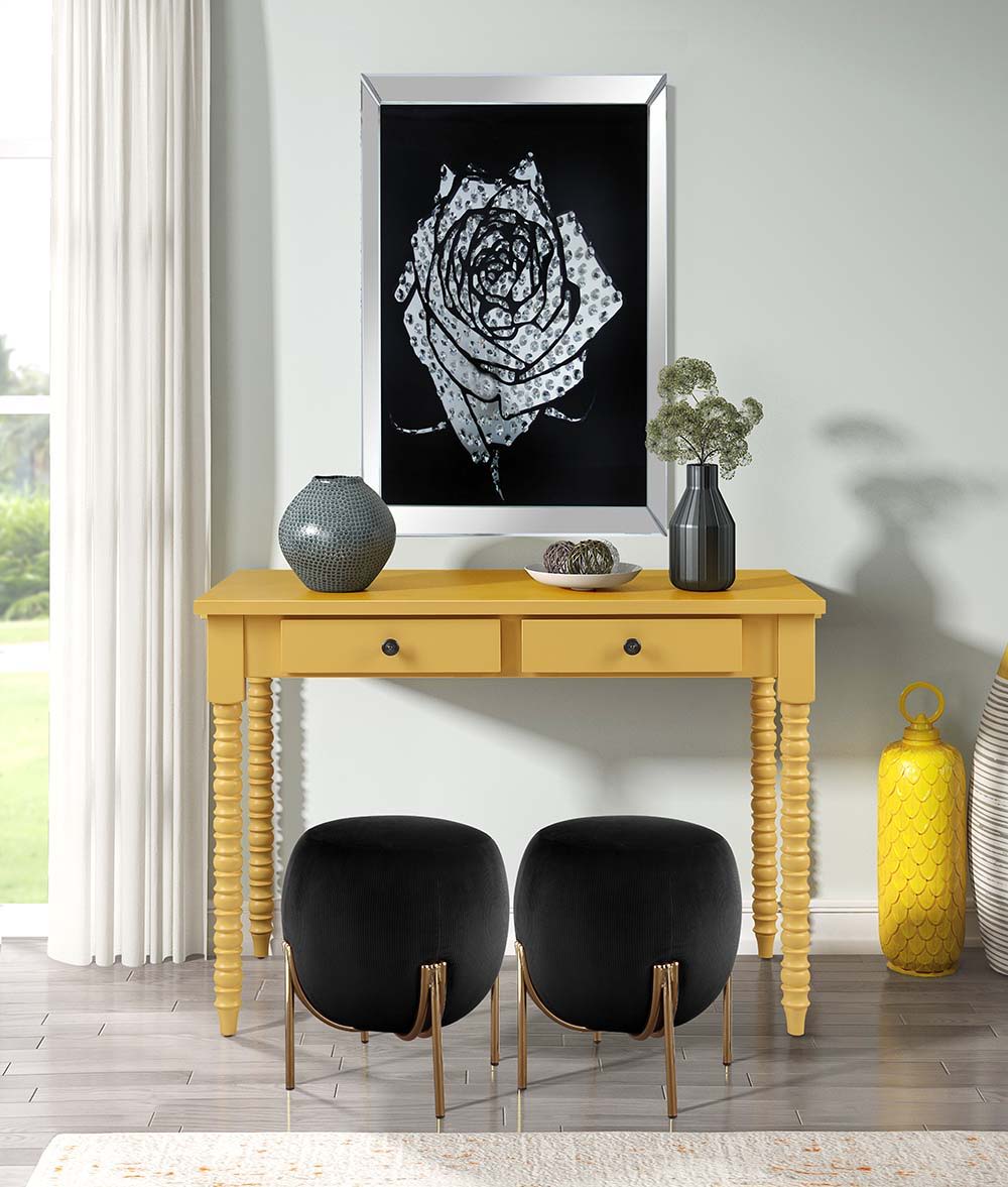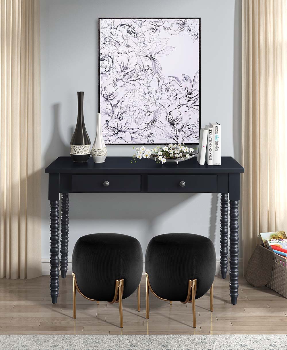 It's traditional look and brilliant finish will fill your workplace with feelings of warmth and comfort. Found atop a wooden frame with ornate carvings , the classic style desk is graced with elaborately turned legs. Two storage drawers help you organize all office supplies and round knobs on the drawer fronts enhance it's vintage charm. Relax your mind and evoke creativity in front of the Altmar Desk.