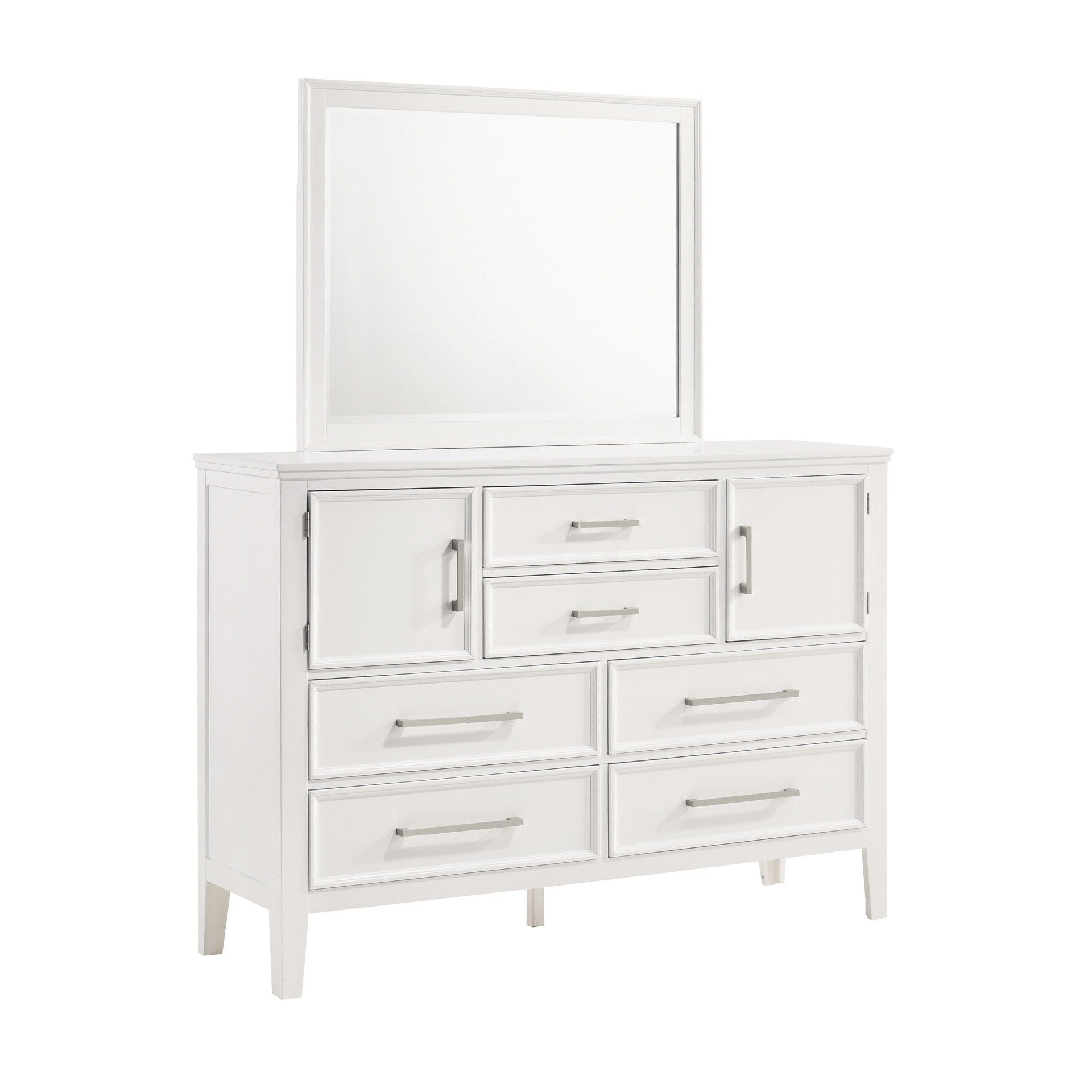 The Andover Dresser Mirror is a perfect complement to any bedroom, combining durability, style, and functionality. Expertly crafted from solid Rubberwood, manufactured woods, and wood veneers, this mirror is built to last while showcasing the natural beauty of real wood. The rich finish is achieved through a meticulous multi-step process, including sand-throughs and white glazing, which imparts a weathered yet sophisticated appeal, highlighting the unique grains and characteristics of the wood. The pristine, low-distortion beveled glass is beautifully encased in picture frame-style moldings, offering a clean and refined look that enhances any space with timeless elegance. This mirror not only serves a practical purpose but also adds a touch of sophistication to your bedroom decor.