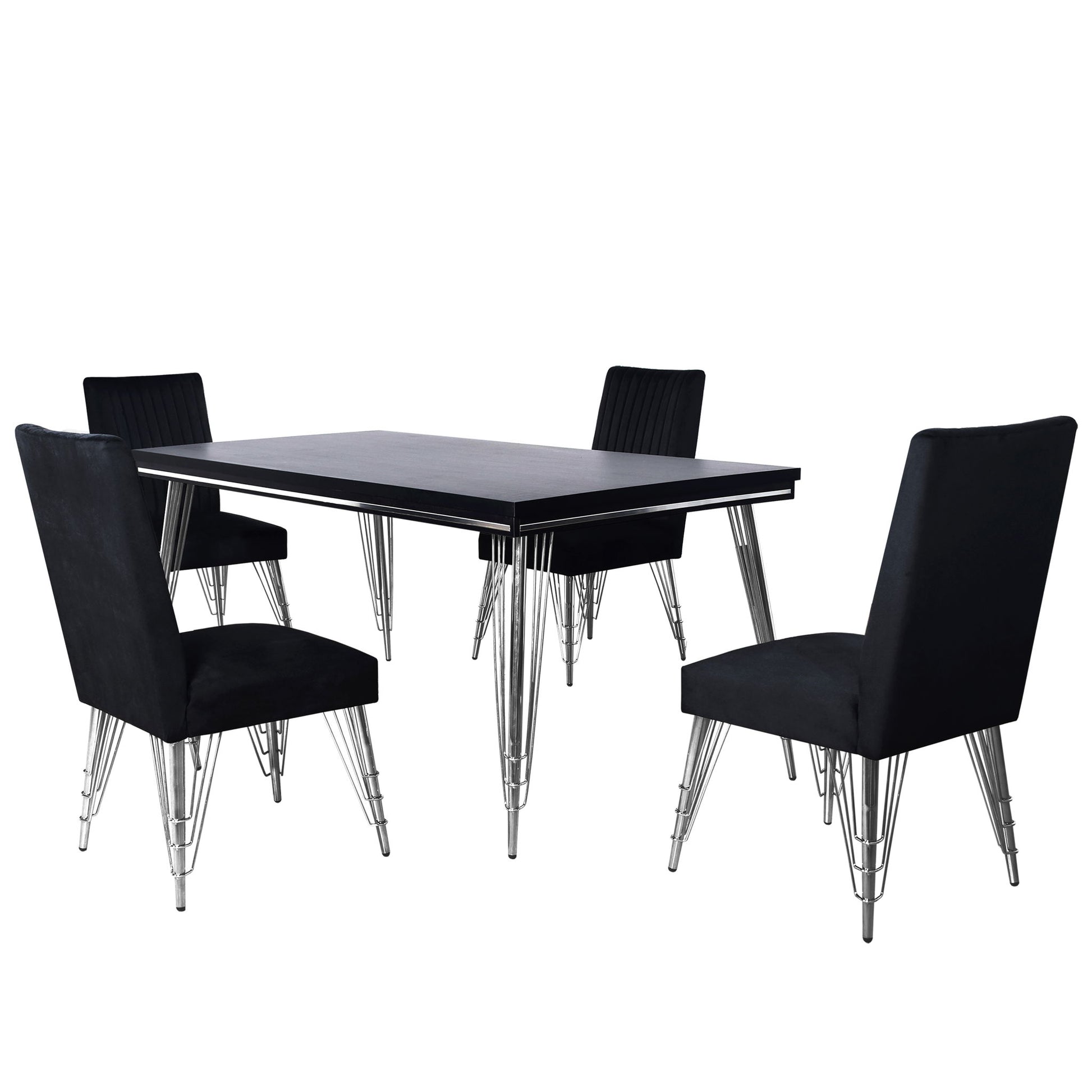 - Harmonized Modern Design: The dining set seamlessly combines the sleek black rectangular table with plush black upholstered chairs, both accented by gleaming hairpin chrome legs, creating a cohesive and contemporary aesthetic perfect for modern interiors.