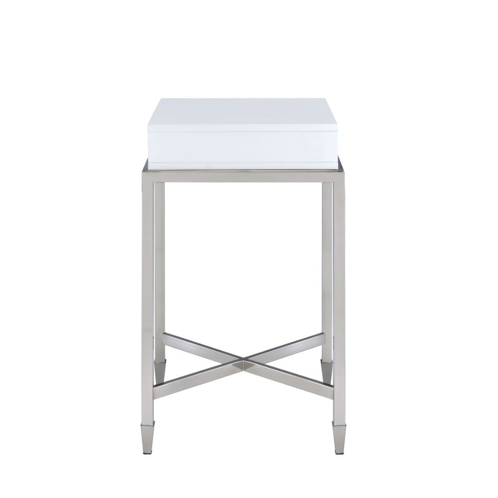 The Belinut side table brings a modern touch to your living room or bedroom with this beautiful table. This table features a finish with a brushed nickel x-base and legs for a sleek look. Includes a drawer with a circular drawer pull for convenient storage.