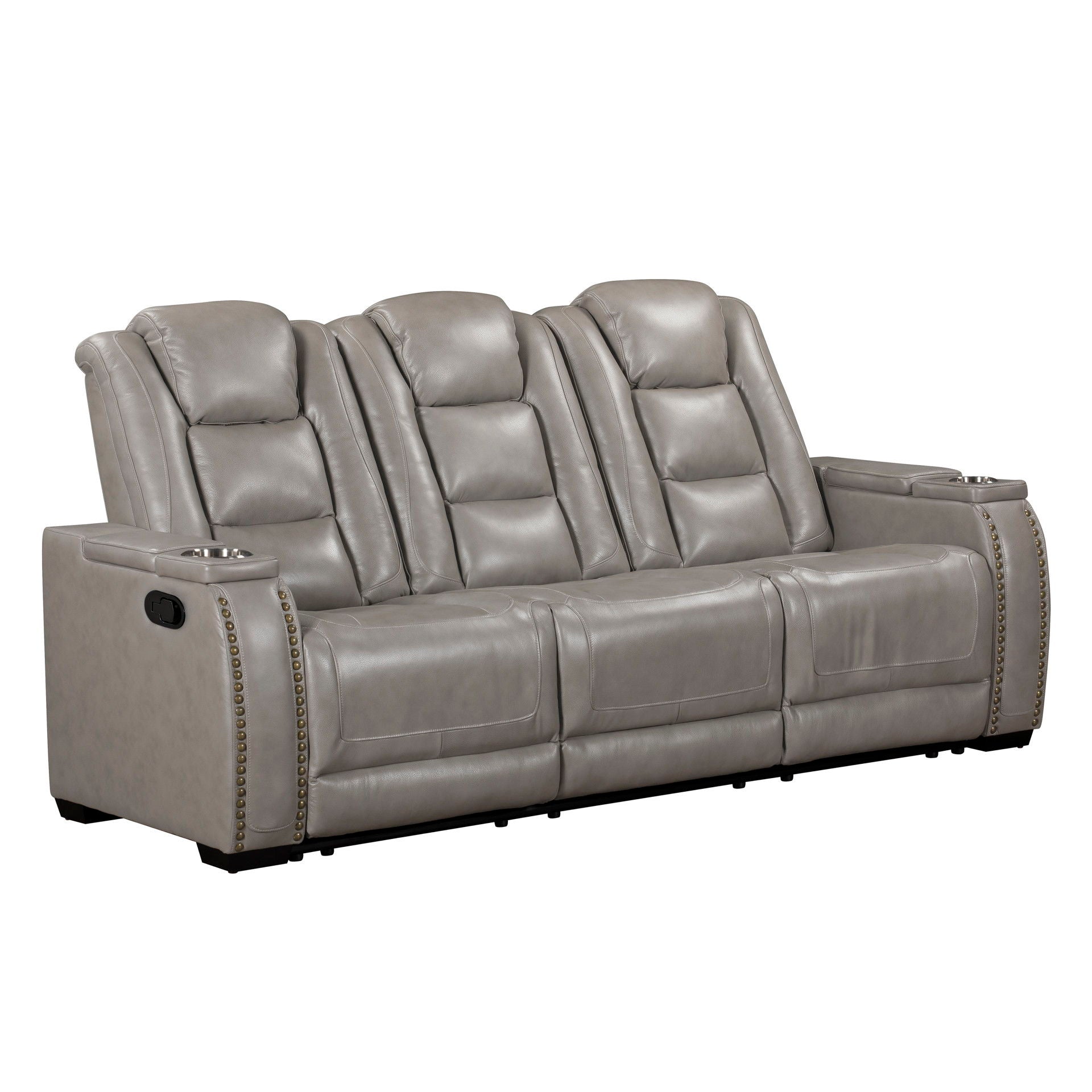 The Breckenridge Genuine Leather Reclining Sofa offers a perfect combination of luxury, durability, and modern convenience, making it an ideal centerpiece for your living space. This reclining sofa is crafted with a blend of hardwood and manufactured woods, ensuring a sturdy and durable frame that provides long-lasting support and reliability. The top-grain leather on the seats, arms, and footrests delivers a luxurious feel, while a matching leather-like material in less-touched areas keeps it affordable without compromising on style or comfort. The design features clean lines and elegant nailhead trim, blending traditional and contemporary elements for a refined, transitional look. Pocket coil seat cushions provide superior comfort with targeted support, minimizing pressure points for a tailored seating experience. The reclining seats allow you to easily find your perfect position for lounging or reading. This sofa is also packed with convenient features, including cupholders integrated into the armrests. Additionally, the sofa includes a drop-down tray, electrical outlets, and reading lights, making it a functional and stylish addition to any home.