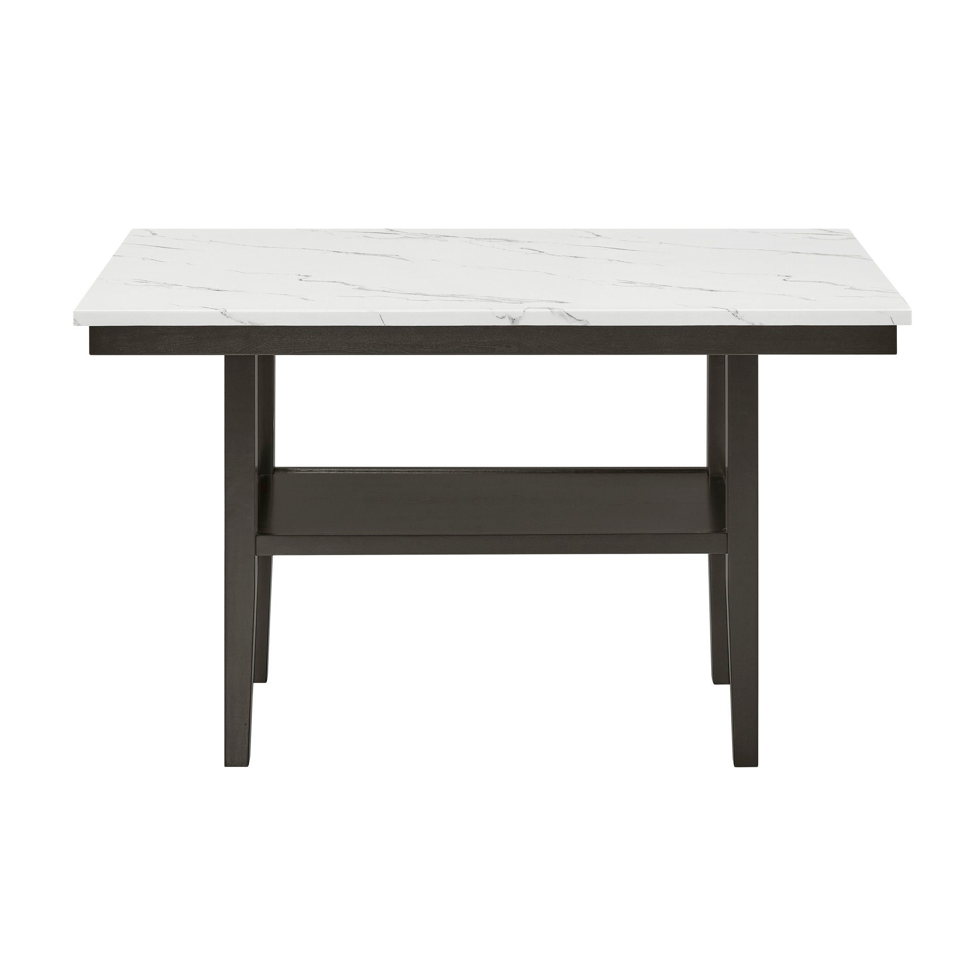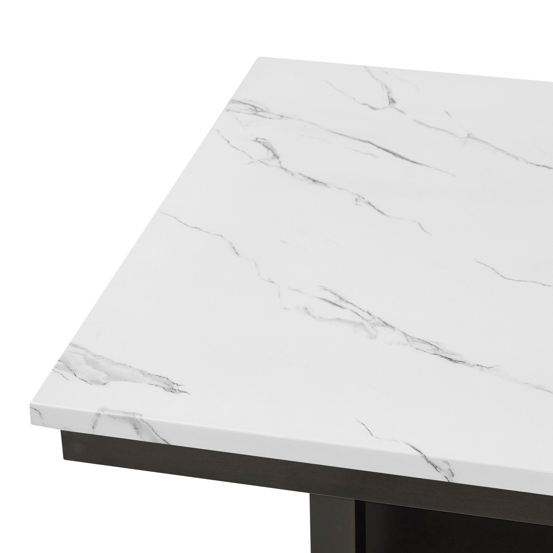 The Carissa Table with Storage Shelf blends modern style and smart functionality. Crafted with durable Rubberwood legs and engineered wood, it features a glossy faux marble top that’s heat- and water-resistant for everyday durability. A lower shelf offers extra storage, while the sleek white and gray veining paired with deep espresso legs creates a chic, contemporary look for your dining space.