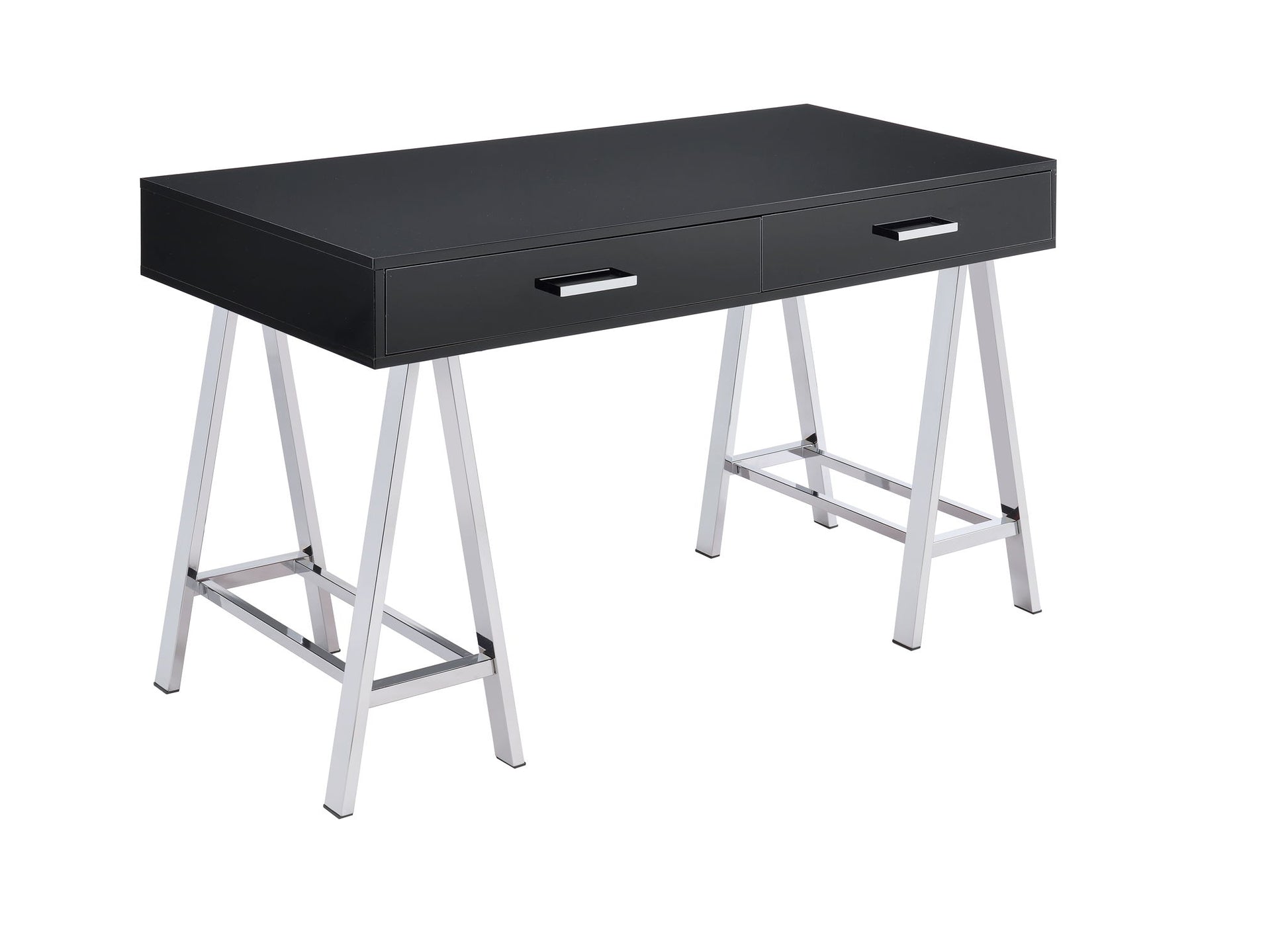 Bring a touch of modern into your home with the Coleen desk, with its high gloss finished top with 2 drawers. It will serve as the perfect place to hold all of your often used supplies. The base is made up of 2 "sawhorse" designed legs finished in chrome to emphasize this modern task desk. Offered in 3 desk top colors white, red, and black.