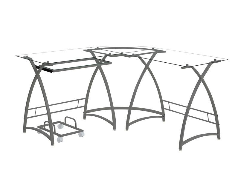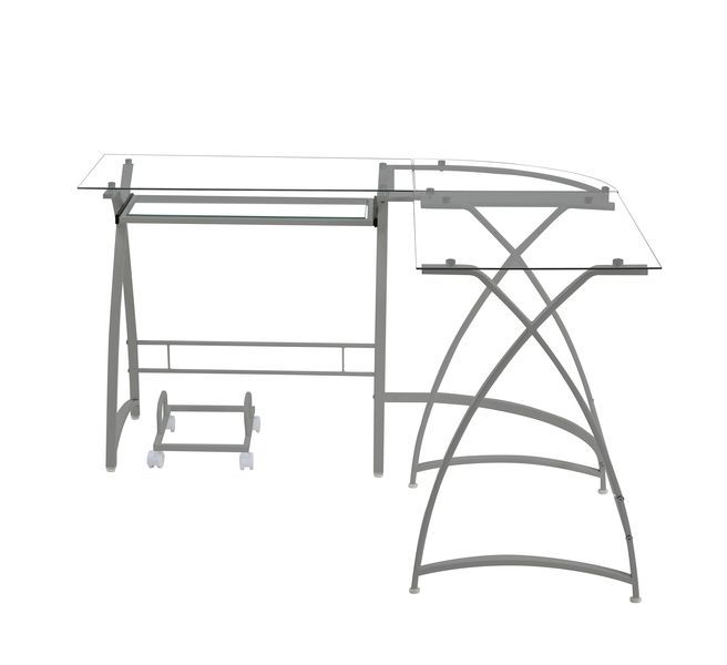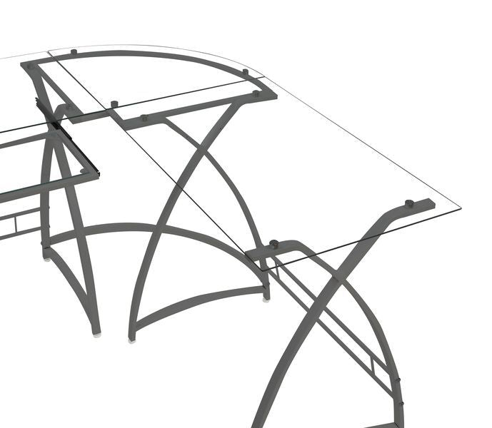 Corner Computer Desk Orientation: "L" ShapeX-Shape Metal Frame BaseRectangular Table Top w/Tempered GlassKey Board Tray IncludedComputer Holder Included