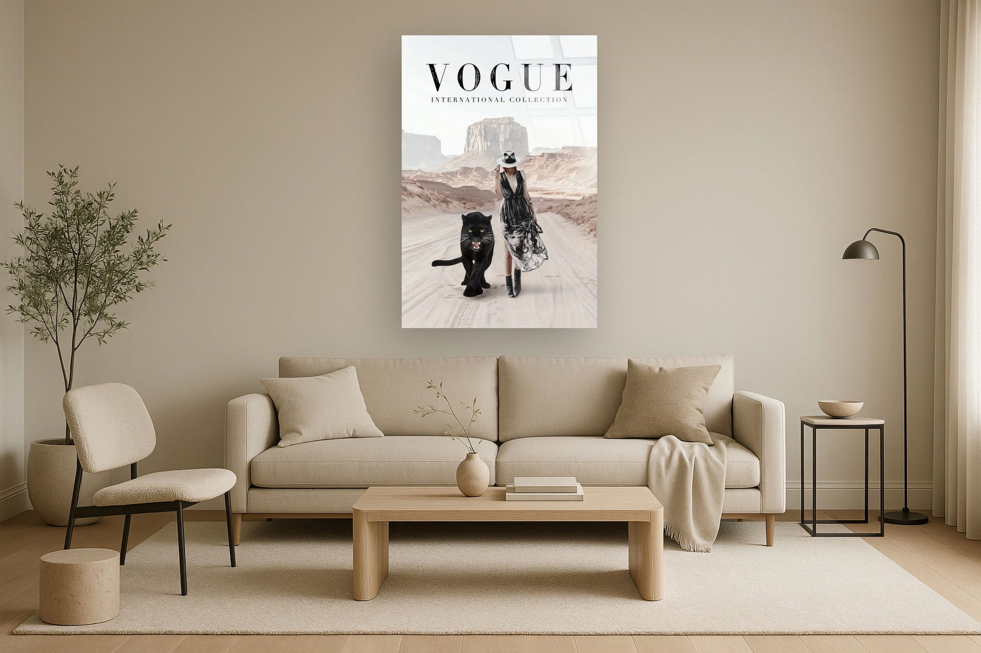 Experience the allure of the wild with 'Desert Companions,' a striking photograph capturing a woman and a panther traversing a vast desert landscape. This frameless, tempered glass piece brings a sense of adventure and elegance to any space, perfect for those who appreciate bold and unique art. The vertical orientation enhances its dramatic impact, making it a captivating focal point for modern interiors.