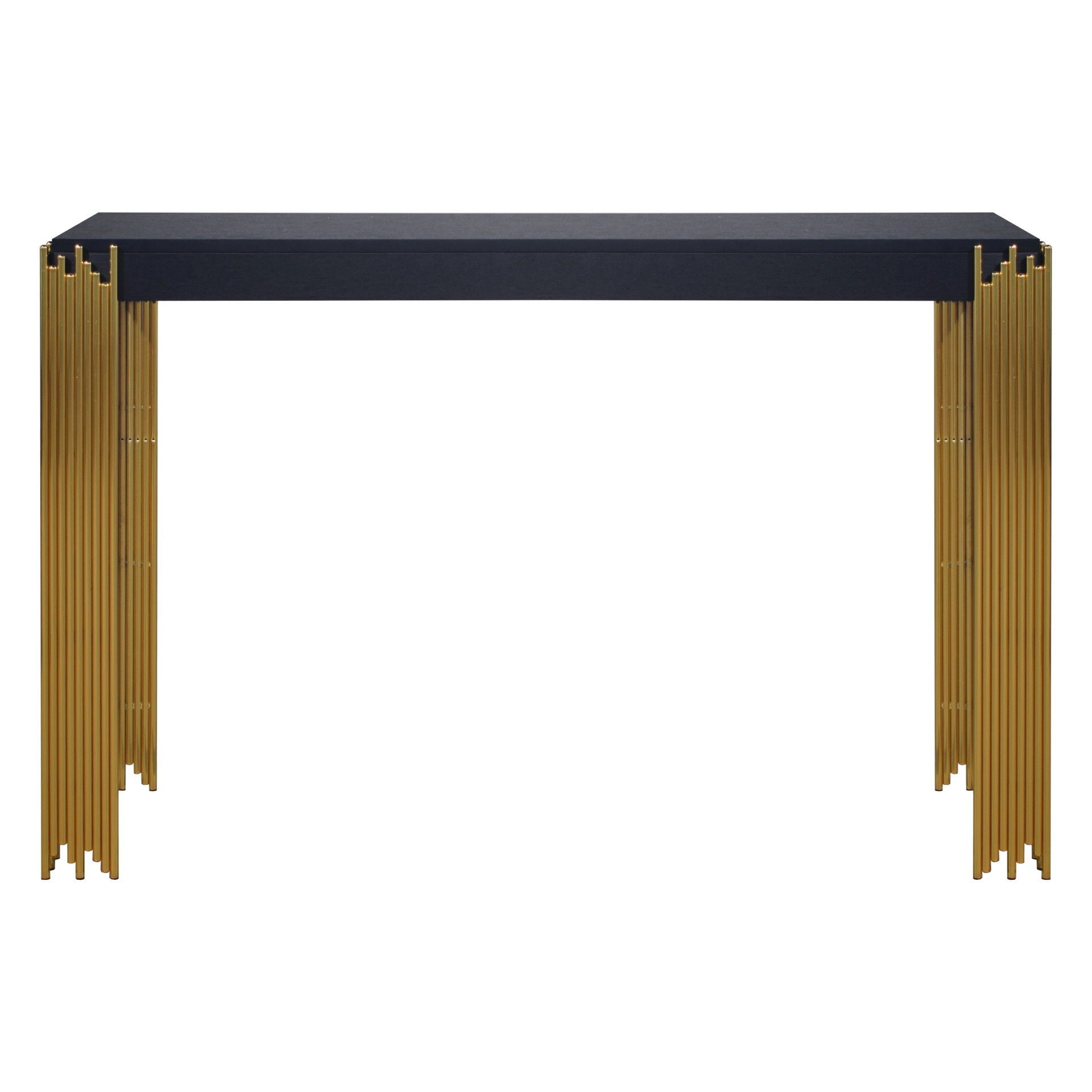 The EMPIRE Console Table in sleek black is a stylish and durable addition to your living space. Crafted with eco-friendly manufactured woods and decorative laminate, this table ensures lasting strength and durability. Its sophisticated black finish adds a touch of contemporary elegance to any room, while the modern metro style, featuring gleaming gold tiered legs, captures the enchanting ambiance of a city skyline shimmering under the stars. Elevate your space with the Empire Console Table, where sleek design meets long-lasting construction.