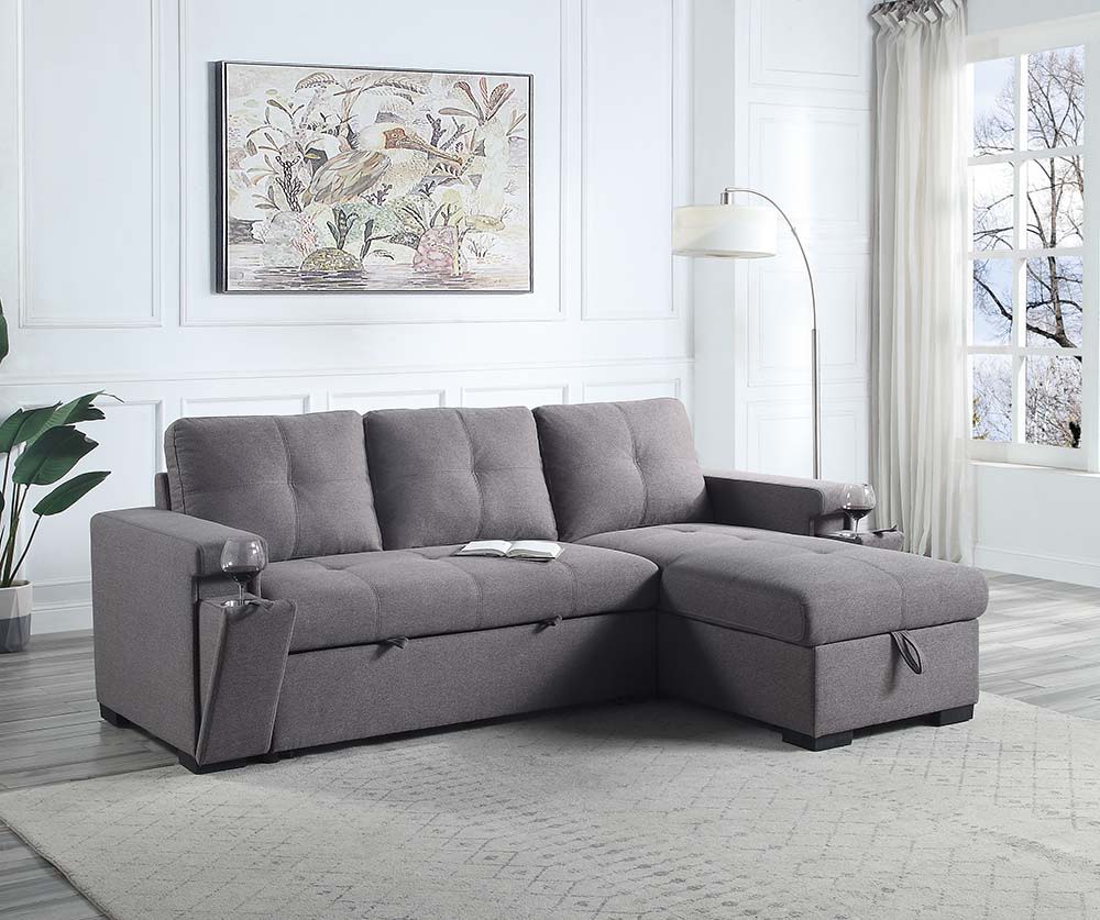 The Jacop sleeper sectional sofa is every modern entertainer's dream. Wide and plush enough to comfortably seat guests for hours. With the added convenience of a pullout sleeper for out-of-town guests. The storage chaise ensures that spare blankets and pillows are always available. Bonus hidden cupholders are smartly located within the armrests, ideal for smaller spaces that don't allow room for end tables.