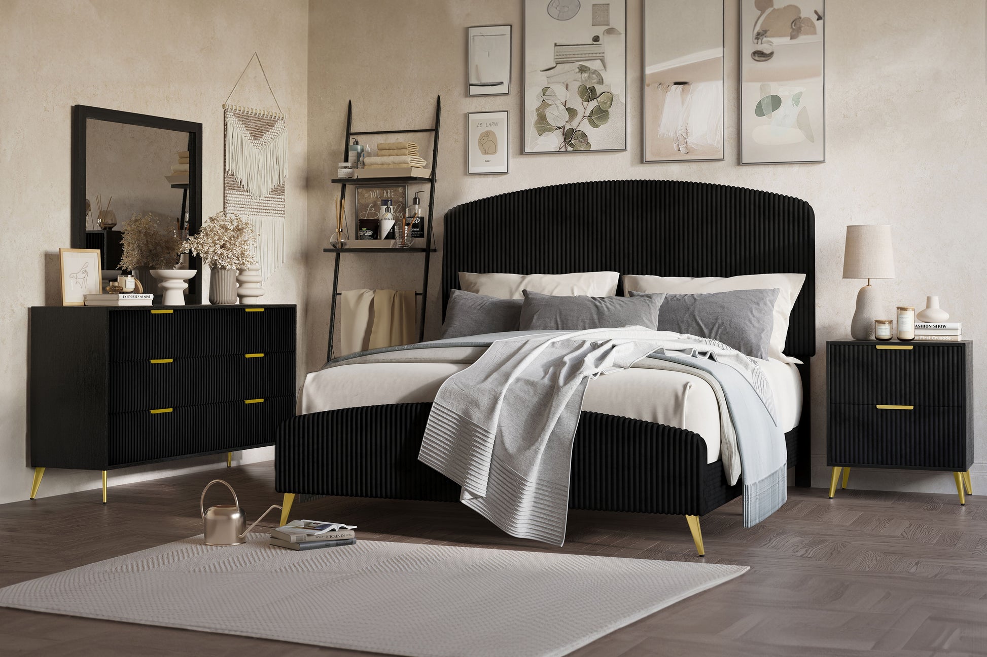 The Kailani Bedroom Set is a masterful combination of modern design, luxurious comfort, and sustainable craftsmanship, perfect for creating a sophisticated and inviting bedroom space. This set includes an upholstered panel bed, dresser, mirror, chest, and two nightstands, all expertly crafted from a durable blend of solid rubberwood, engineered wood, and eco-friendly decorative laminate. The construction ensures long-lasting beauty with superior resistance to scratches, moisture, and stains, making maintenance a breeze. The modern minimalist design features clean lines, a sleek silhouette, and chic ribbed textures, complemented by slim metallic handles and tapered legs that enhance the contemporary aesthetic. The bed, wrapped in plush 100% Polyester Velvet, exudes warmth and sophistication, with a generously padded headboard ideal for relaxation. The matching furniture, with its textured drawers highlighted by gleaming gold pulls and angled legs, adds a touch of glamour to the set, making it a standout in any bedroom. The spacious drawers are designed for seamless functionality, featuring fully finished interiors, full-extension slides, and durable dovetail joinery for smooth, snag-free storage and lasting strength. With easy assembly, requiring just 60 minutes to set up the bed and secure the casegood legs and drawer pulls, the Kailani Bedroom Set offers both style and convenience, making it a perfect addition to any modern home.