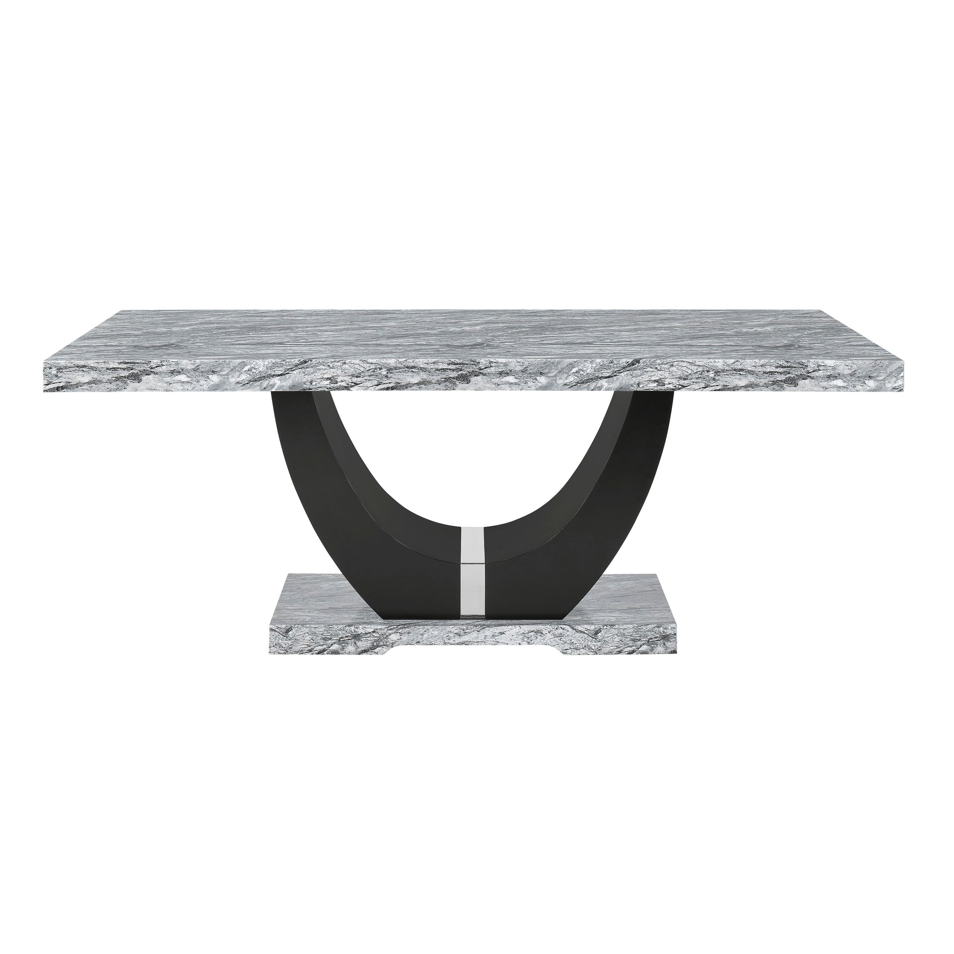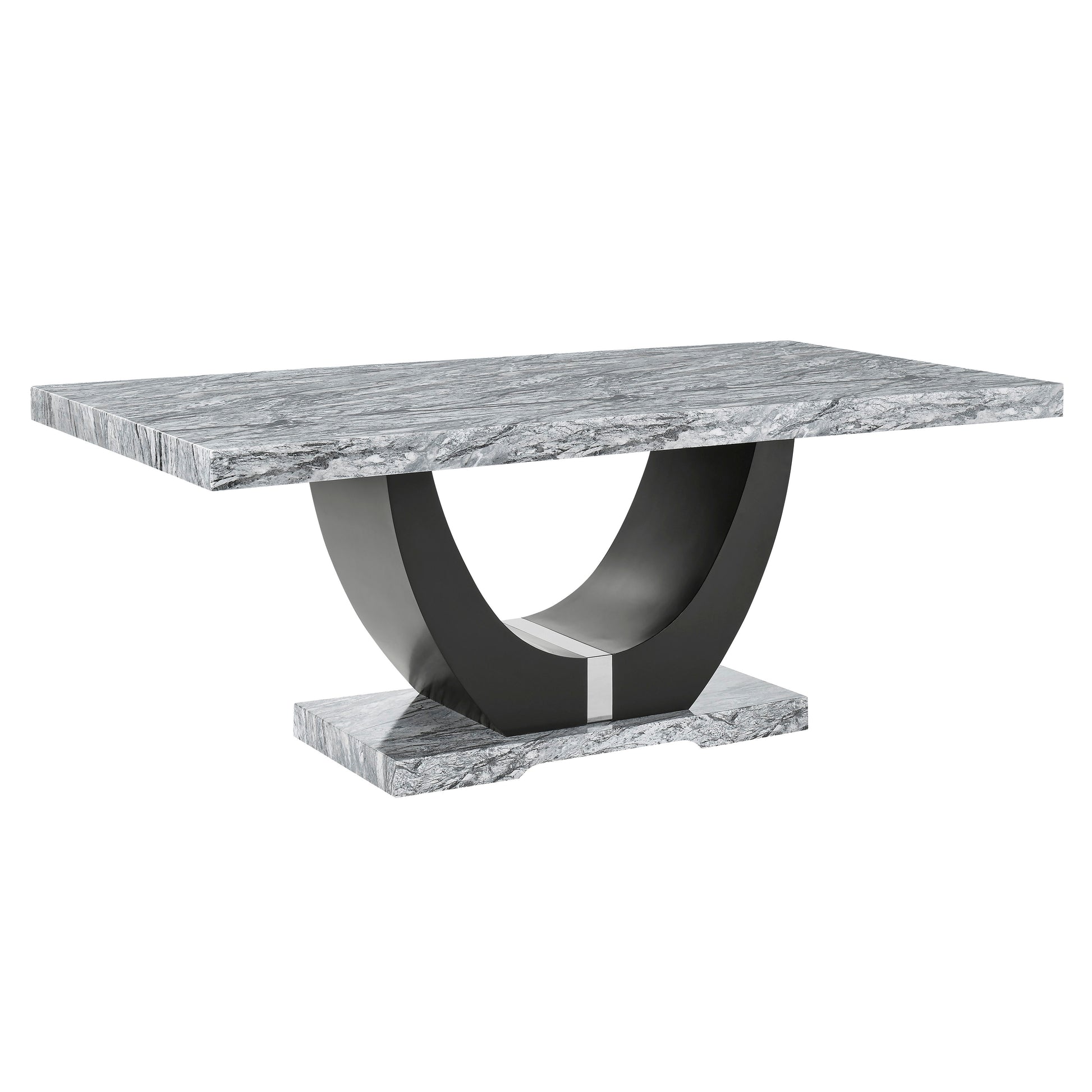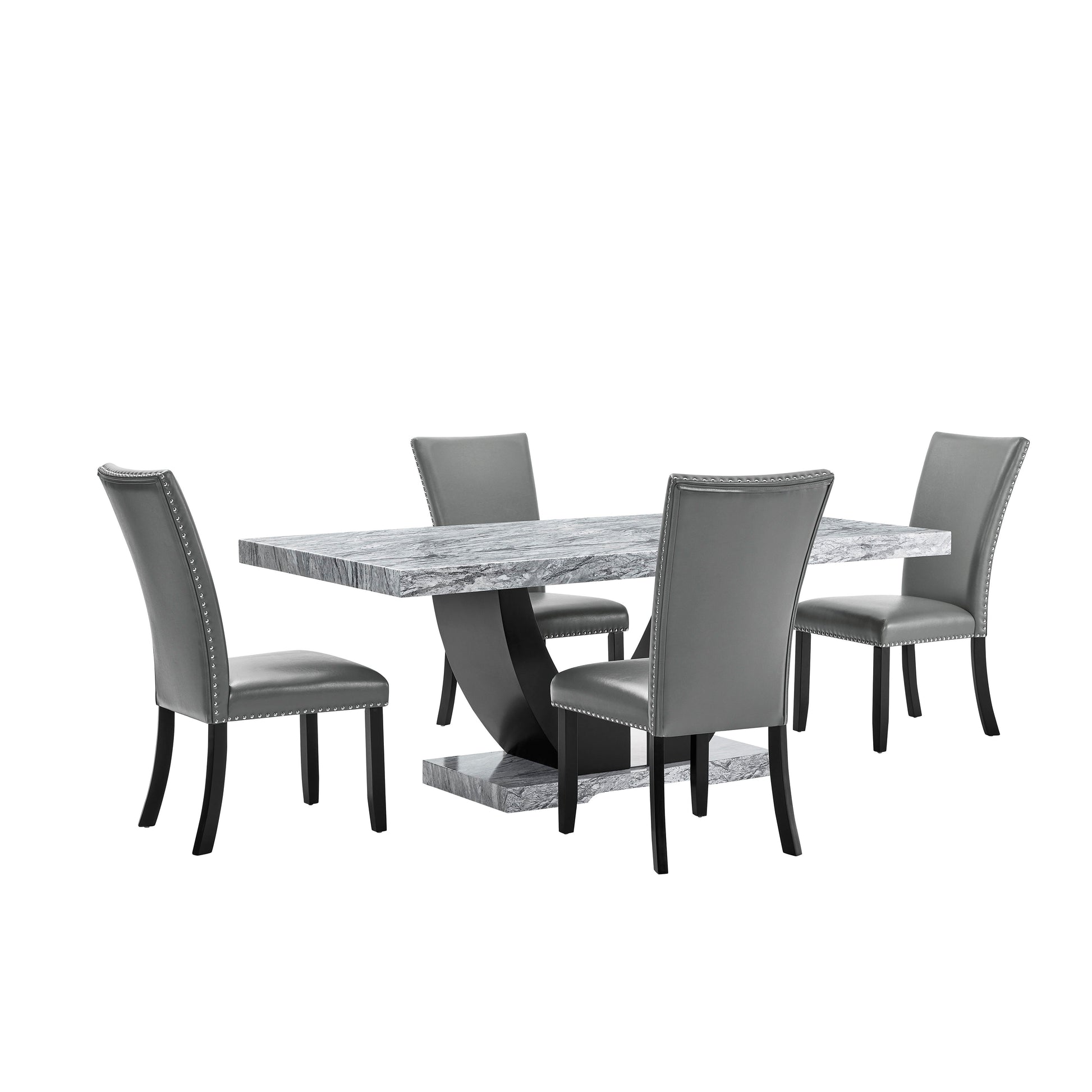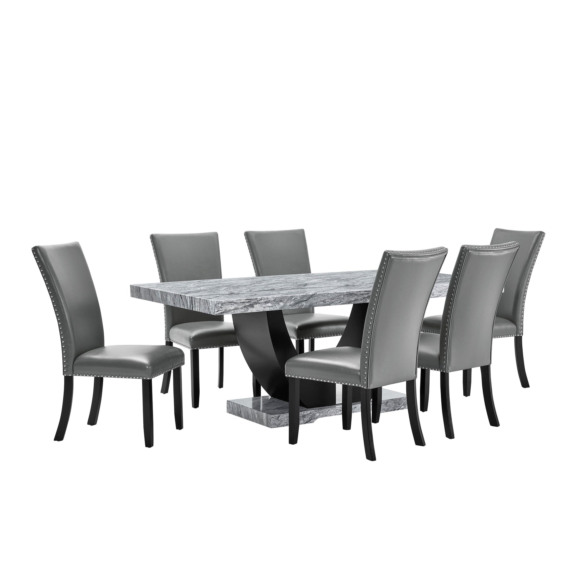 Transform your dining experience with the Lyra Dining Set, a perfect blend of style and practicality. This set features a striking faux marble table and chic upholstered chairs, designed to bring a touch of contemporary glam to your home. The gray and black faux marble tabletop creates a stunning contrast with the solid black U-shaped pedestal base, making it a true centerpiece. Built with a combination of solid and manufactured woods, this dining set is crafted to last. Enjoy the luxurious look of the faux marble surface, which resists water and is easy to clean for effortless upkeep. The sleek upholstered chairs, accented with black legs and silver nail head trim, add a sophisticated edge to your dining space. With fully upholstered backs and supportive foam seat cushions, these chairs offer unparalleled comfort for your dining pleasure. Enhance your home with the Lyra Dining Set and enjoy a perfect mix of elegance, comfort, and convenience.