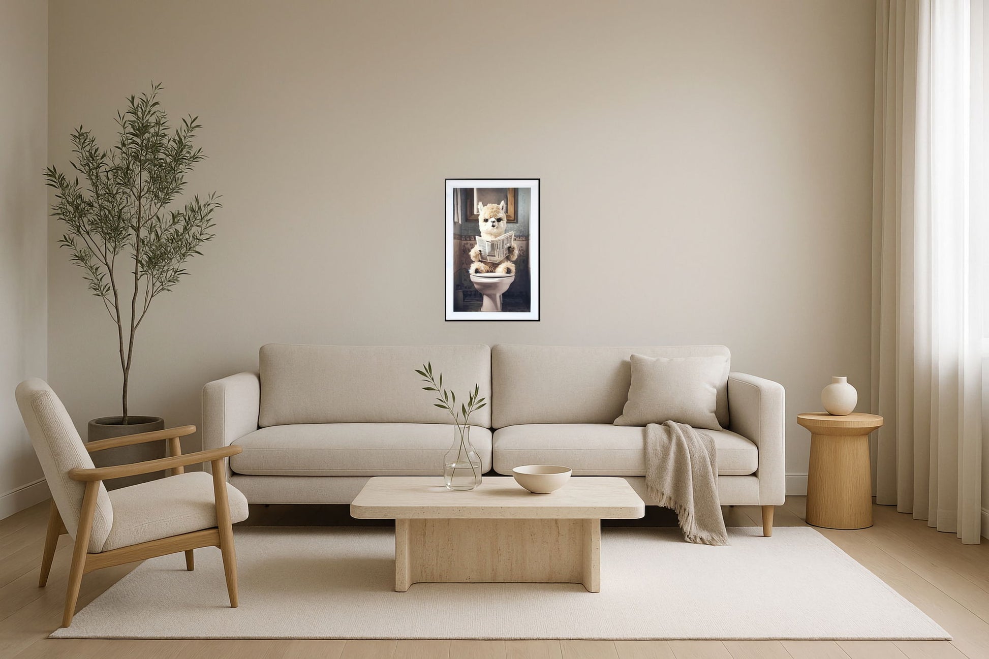 Add a touch of humor to your space with this whimsical alpaca art piece. Perfect for a playful bathroom or a quirky living room, this framed graphic art brings joy and laughter. The charming alpaca reading a newspaper is sure to be a conversation starter.