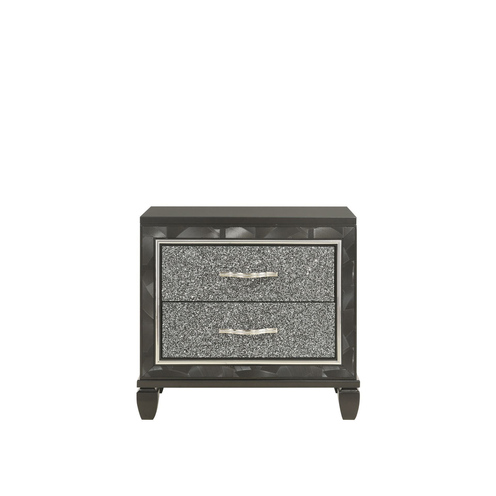 Discover the RadianceTwo Drawer Nightstand, a perfect blend of quality construction and luxurious finish. Crafted from a combination of Solid Rubberwood and manufactured woods, this nightstand offers ultimate stability and durability. The semi-gloss lacquer finish provides a silky, modern framework to this eye-catching collection. Glamorous details such as Glossy textured inlays and mylar trim frame the drawers, which showcase a crushed crystal look decorative laminate front, topped by brushed chrome finish handles with inset crystal accents. The heirloom-quality English dovetail drawers operate smoothly on full extension glides, with finished interiors providing snag-free storage. The top drawers have felt lining, offering added protection for your jewelry, watches, or glasses. Add a glamorous appeal to your bedroom with the Radiance Nightstand.