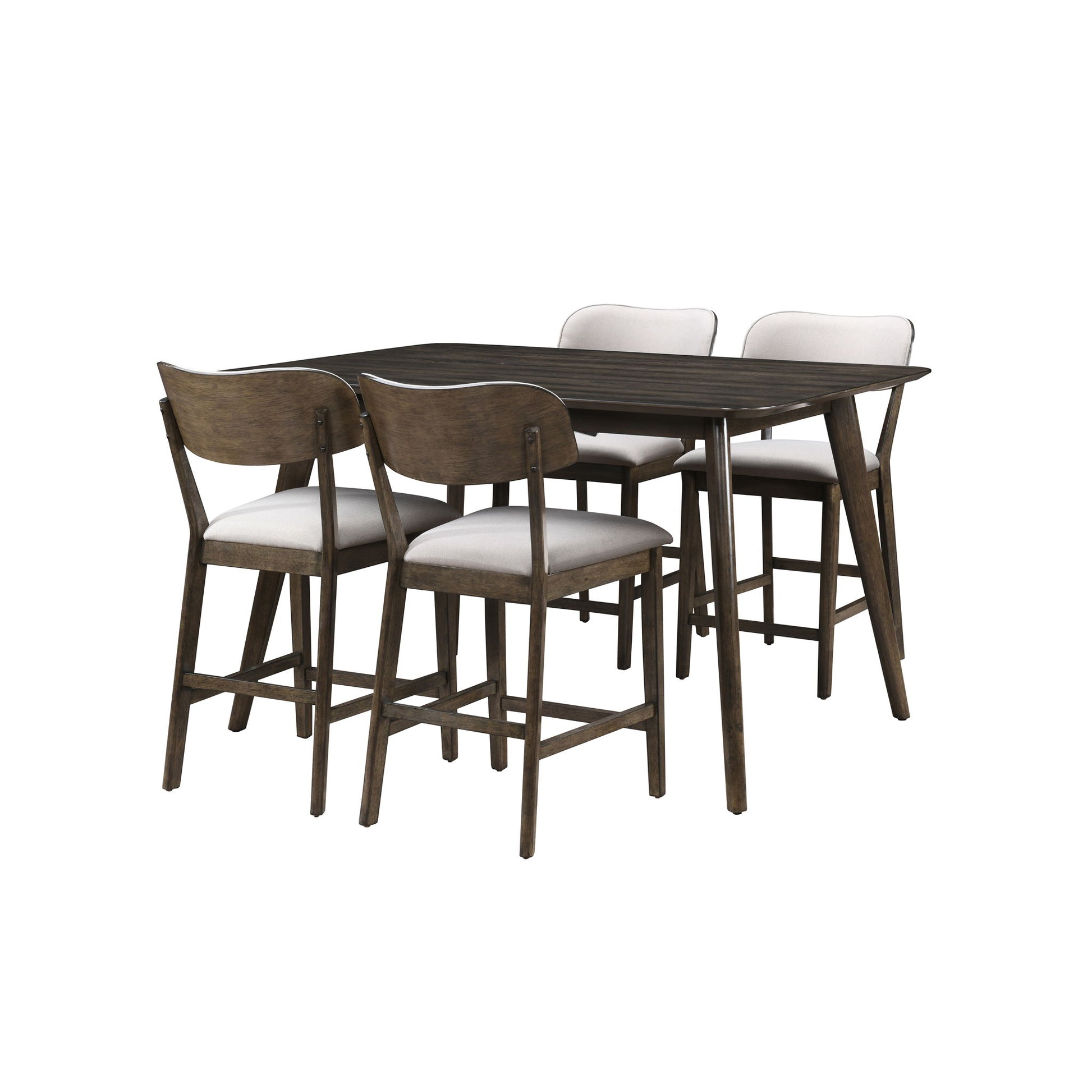 The Rex Mid-Century Modern Wood Counter Dining Set combines sleek design with everyday practicality, making it a great choice for both casual meals and gatherings. This set includes a spacious counter-height table and matching counter stools, all crafted from solid rubberwood, manufactured woods, and oak veneers for durability and long-lasting use. The minimalist design, with clean lines, rounded edges, and angled, tapered legs, captures the essence of classic Mid-Century Modern style. Finished in a rich, hand-rubbed walnut brown with a clear topcoat, the set highlights the natural beauty of the wood grain. Each stool offers comfortable seating with softly curved backrests and resilient foam cushions wrapped in easy-care 100% polyester fabric. Perfect for larger dining spaces, this table comfortably seats up to six, providing the ideal spot for dining and conversation.