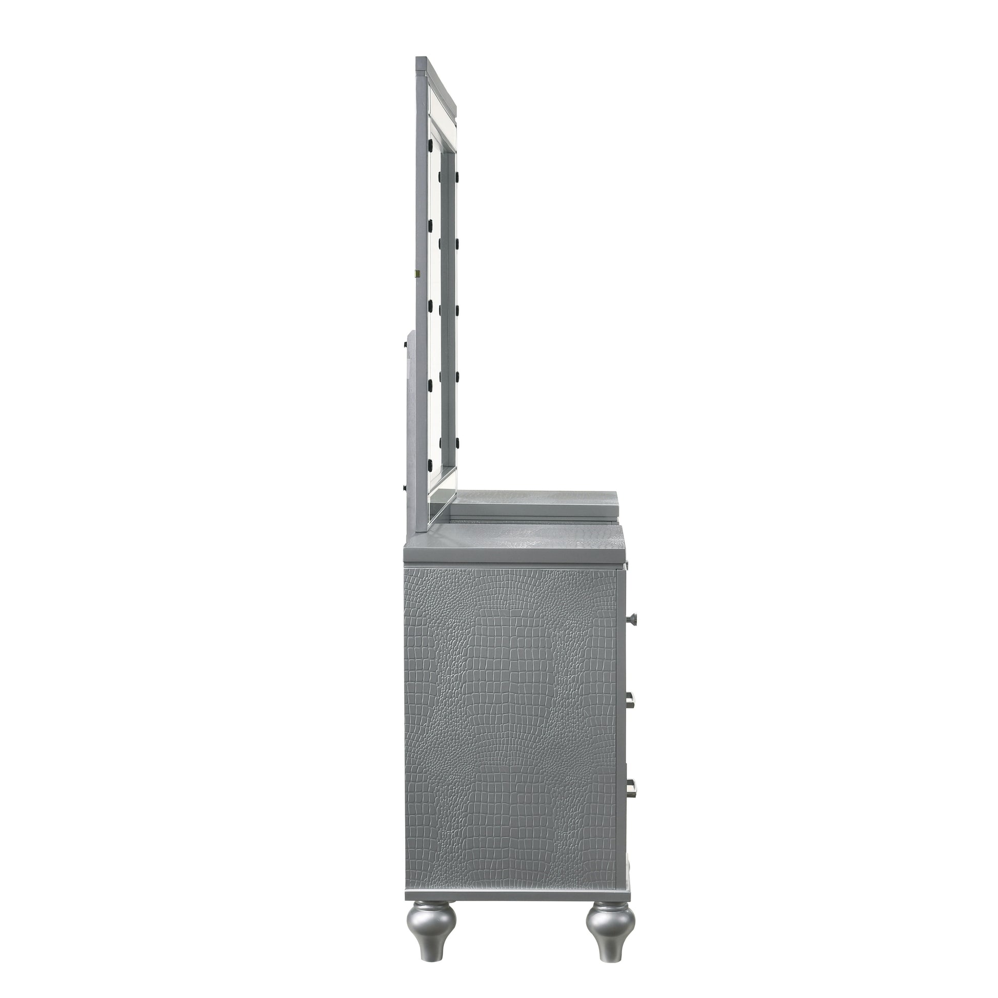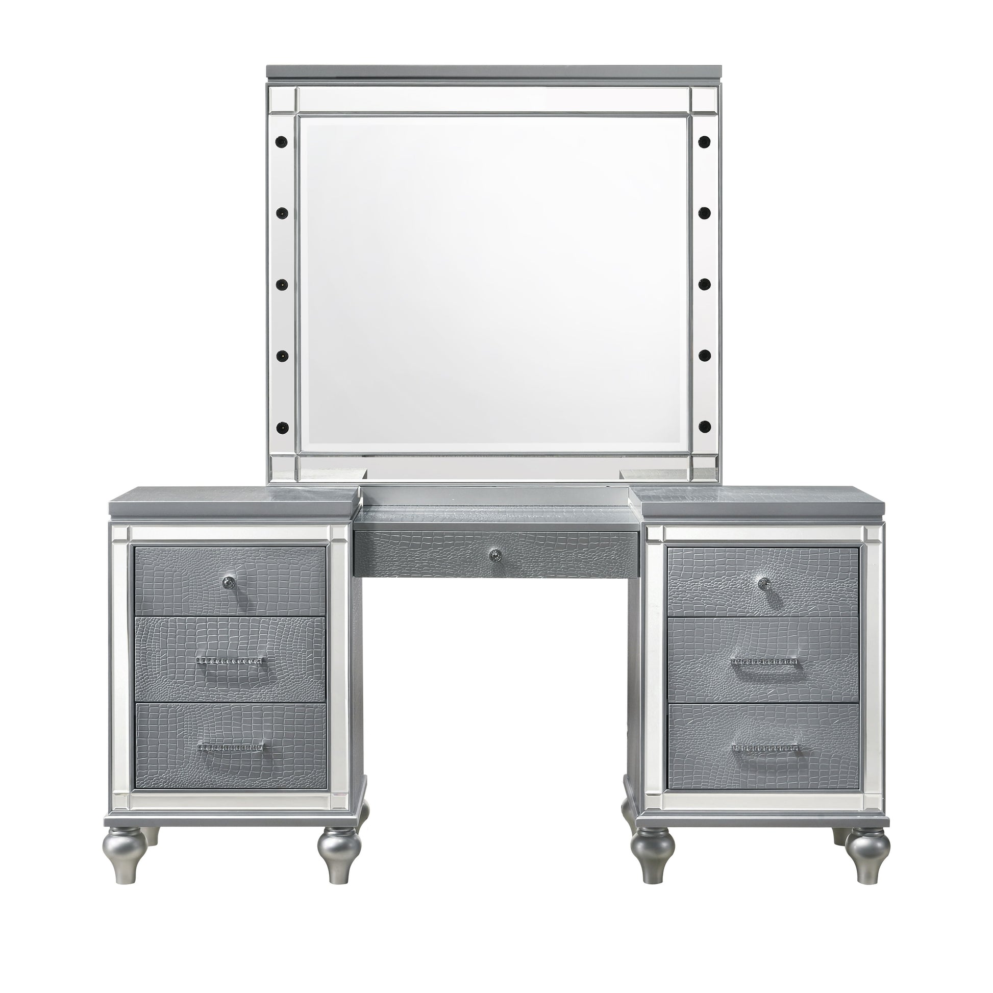 The Valentino Vanity is a stunning addition to any bedroom or dressing area. Made from a combination of manufactured and solid woods with decorative embossed inlays, this set ensures long-lasting quality and distinctive style. The gleaming finish, mirrored trims, crystal-studded drawer pulls, and alligator embossed inlays evoke a Hollywood glam appeal. The seven-drawer vanity table provides ample storage for cosmetics and accessories, including a velvet-lined drawer for jewelry, making it as practical as it is stylish. This exquisite vanity set seamlessly combines functionality with a touch of star quality, bringing an elegant and glamorous touch to your space.