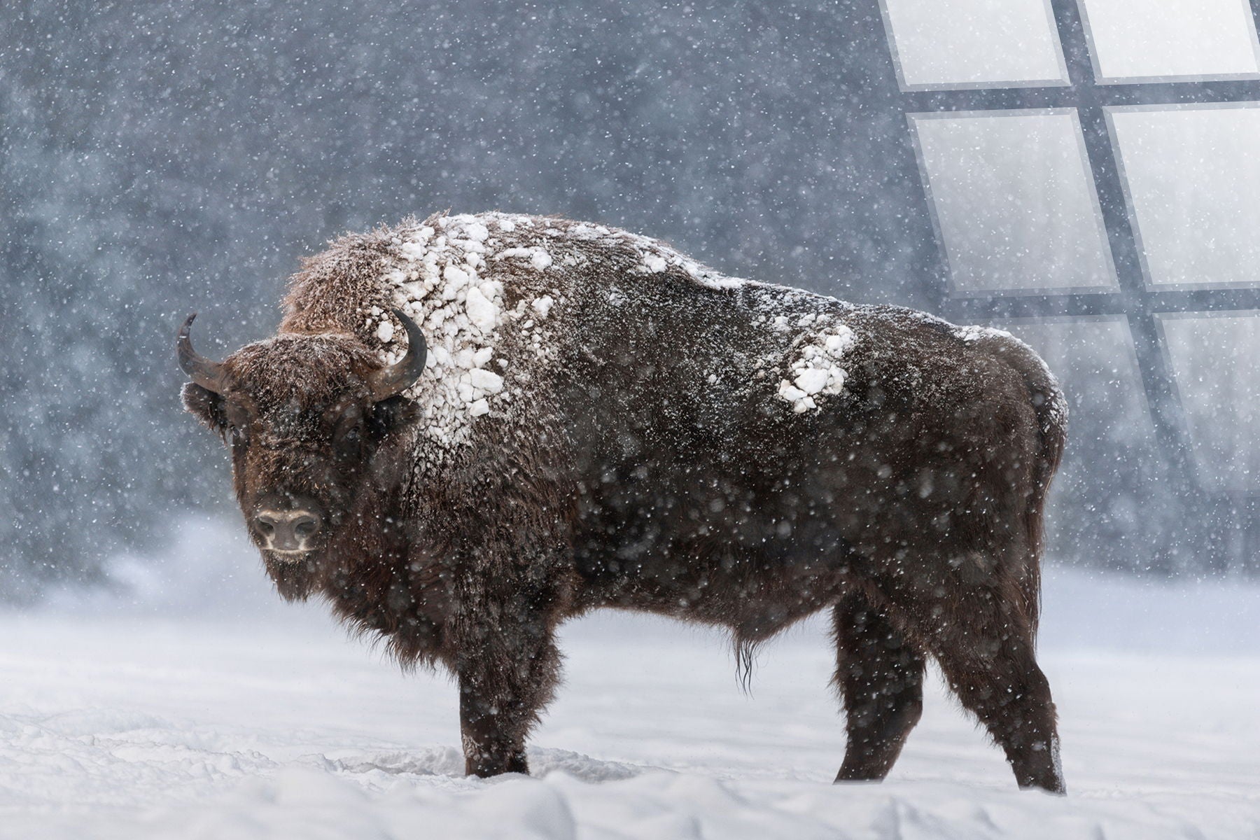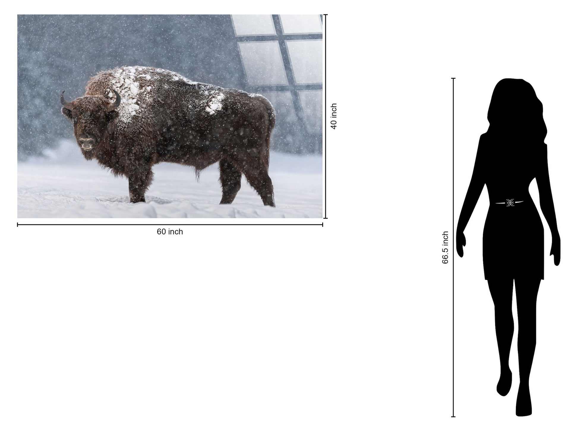 Experience the serene beauty of winter with this stunning photograph of a bison standing proudly amidst a gentle snowfall. The image captures the majestic presence of the bison, its coat dusted with snowflakes, set against a tranquil winter landscape. Perfect for adding a touch of nature's elegance to your living space.